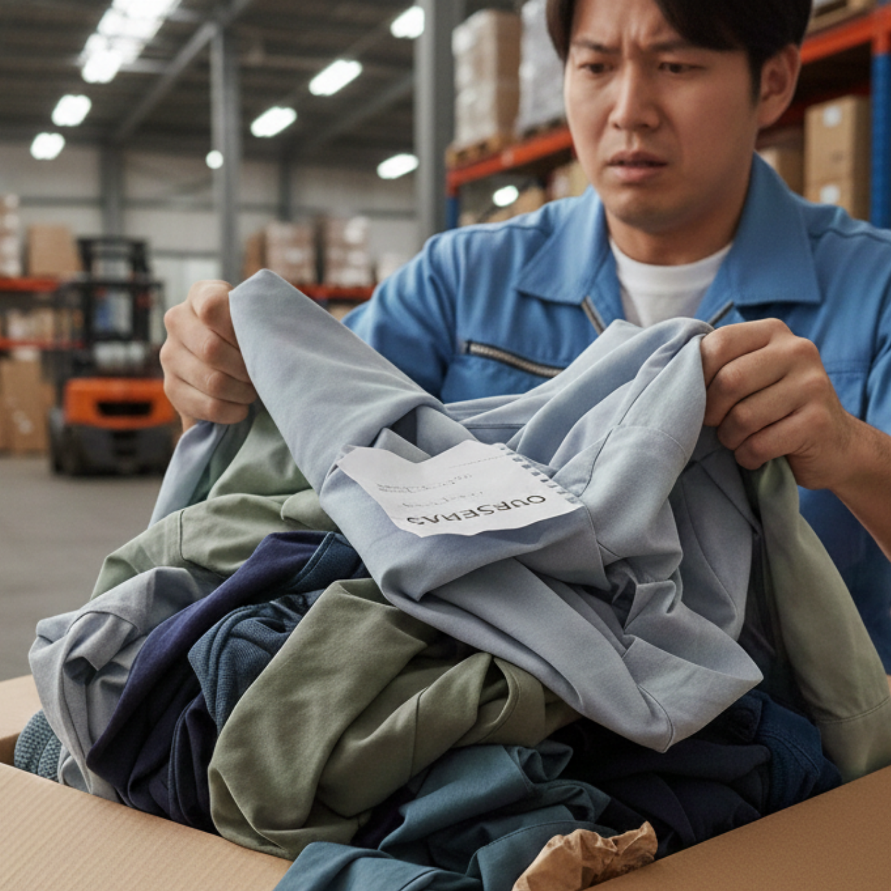 ひとつひとつの製品が出荷できる状態かを、仕分ける作業となります。弊社が得意とする衣類の場合は、汚れや糸のほつれ、破れ、色落ちなどがないか確認を致します。工場から送られてきた、各製品を手作業で丁寧に確認をしておりますので、ご安心下さいませ。
